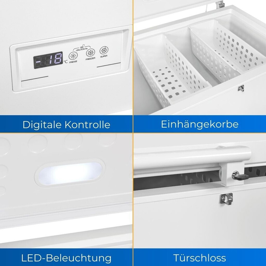 Die Ausstattung der Gefriertruhe umfasst zwei praktische Vorratskörbe, die eine übersichtliche Organisation der Lebensmittel ermöglichen. Eine Innenraumbeleuchtung sorgt zudem für gute Sichtverhältnisse und erleichtert das Finden der gewünschten Produkte. Mit Maßen von 112 cm Breite, 84,5 cm Höhe und 70 cm Tiefe lässt sich die Gefriertruhe flexibel in verschiedenen Räumlichkeiten aufstellen. Die praktischen Rollen erleichtern zudem den Transport und die Positionierung des Geräts.
