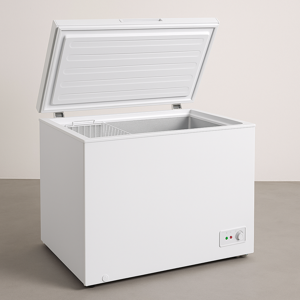 Die Gefriertruhe verfügt über einen Vorratskorb, eine Innenraumbeleuchtung, Schnellgefrieren und eine Kindersicherung.