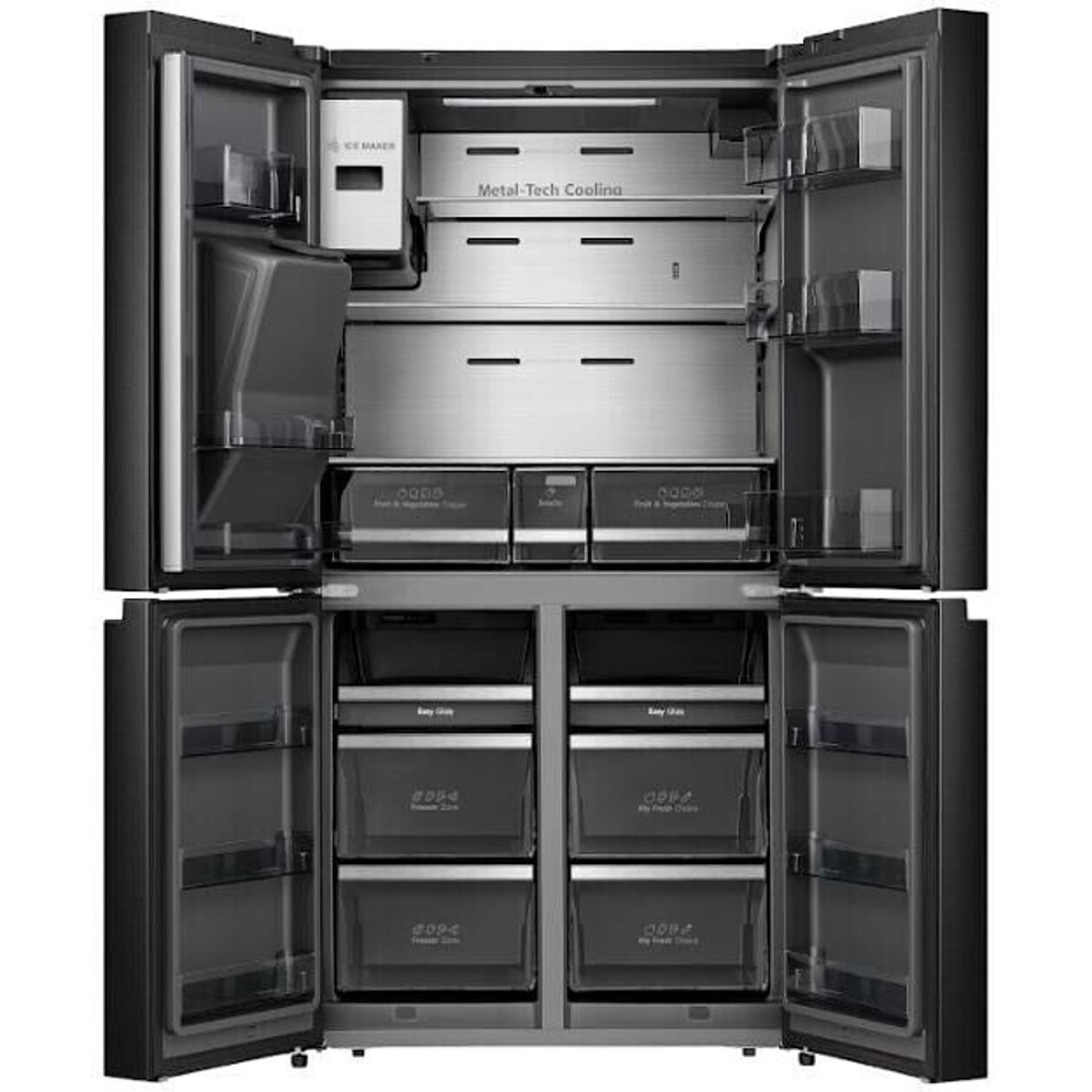 Der Innenraum des Hisense RQ760N4IFE bietet Abstellflächen, einen Eiswürfelspender, einen Wasserspender und einen Crusher für zusätzlichen Komfort.