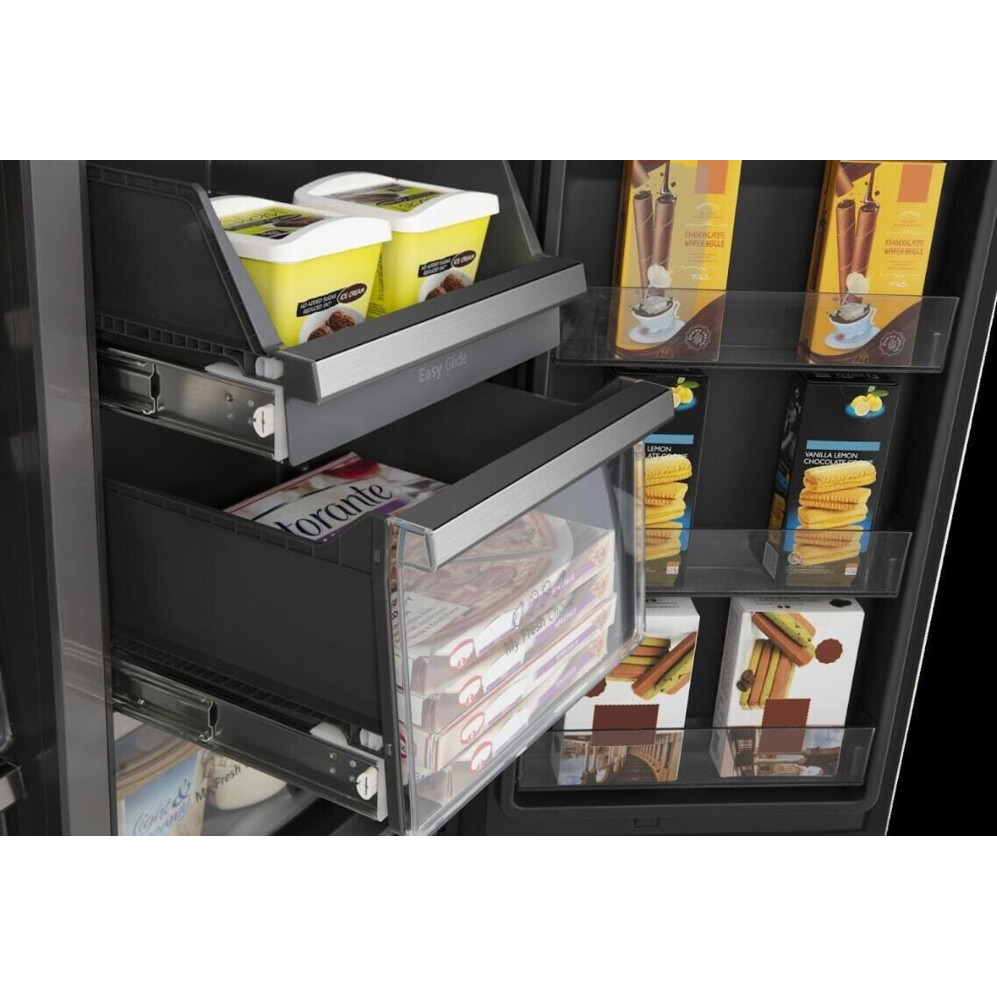 Zu den weiteren Ausstattungsmerkmalen gehören ein Eiswürfelspender, ein Wasserspender und ein Crusher, die das Küchererlebnis erweitern. Mit Funktionen wie Schnellkühlen, Schnellgefrieren, getrennt regelbarem Kühl-/Gefrierteil, Abtauautomatik im Kühlteil und einer Urlaubsschaltung bietet der Kühlschrank hohen Komfort.