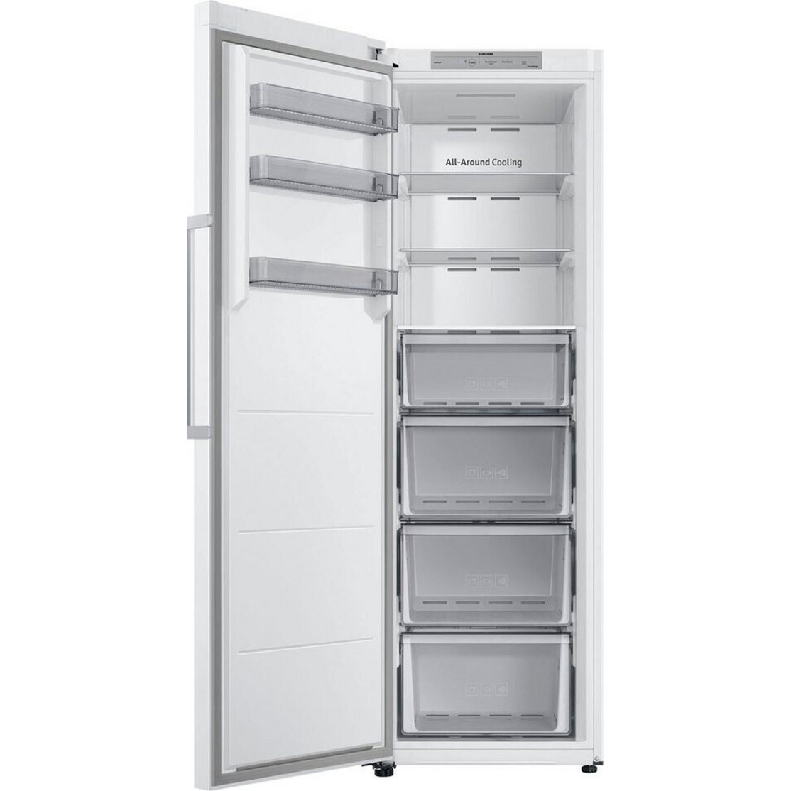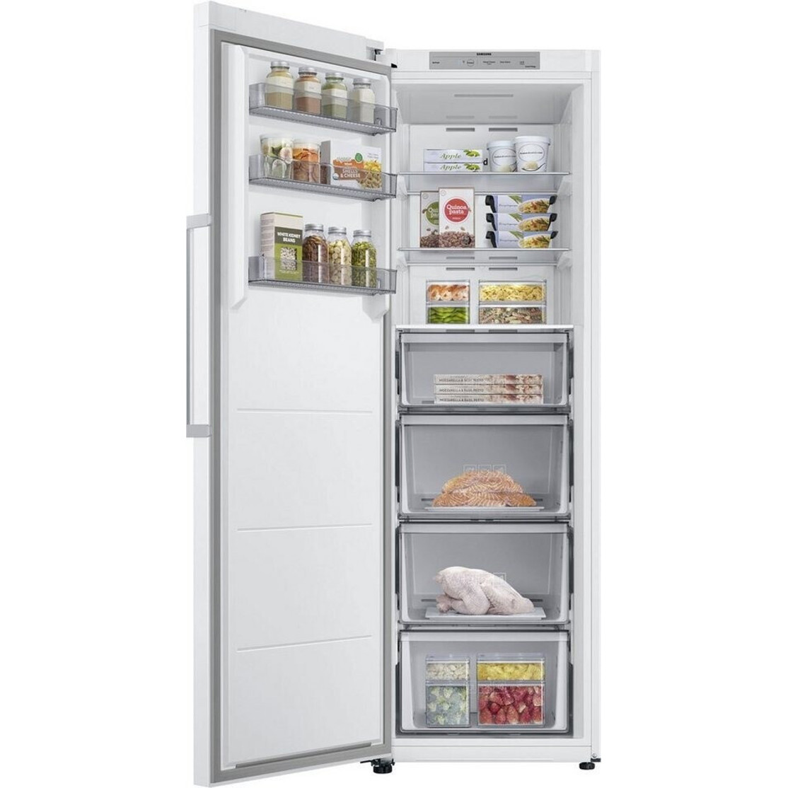 Der Samsung RZ32C7AE6WW/EG Standgefrierschrank in elegantem Weiß ist eine freistehende Lösung für Haushalte, die viel Gefrierraum benötigen. Mit einem Gefrierbereich von 323 Litern eignet sich dieses Gerät ideal für große Haushalte, die Wert auf Organisation und Komfort legen. Die No-Frost-Technologie verhindert Eisbildung, sodass Sie manuelles Abtauen vergessen können. Die Schnellgefrieren-Funktion ermöglicht es Ihnen, frische Lebensmittel schnell einzufrieren und so deren Qualität zu bewahren.