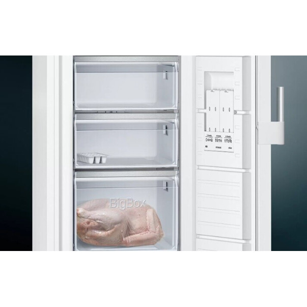 Der Gefrierschrank verfügt über eine varioZone, multiAirflow, freshSense, eine BigBox, Supergefrieren, sowie einen Kälteakku und eine Eiswürfelschale.