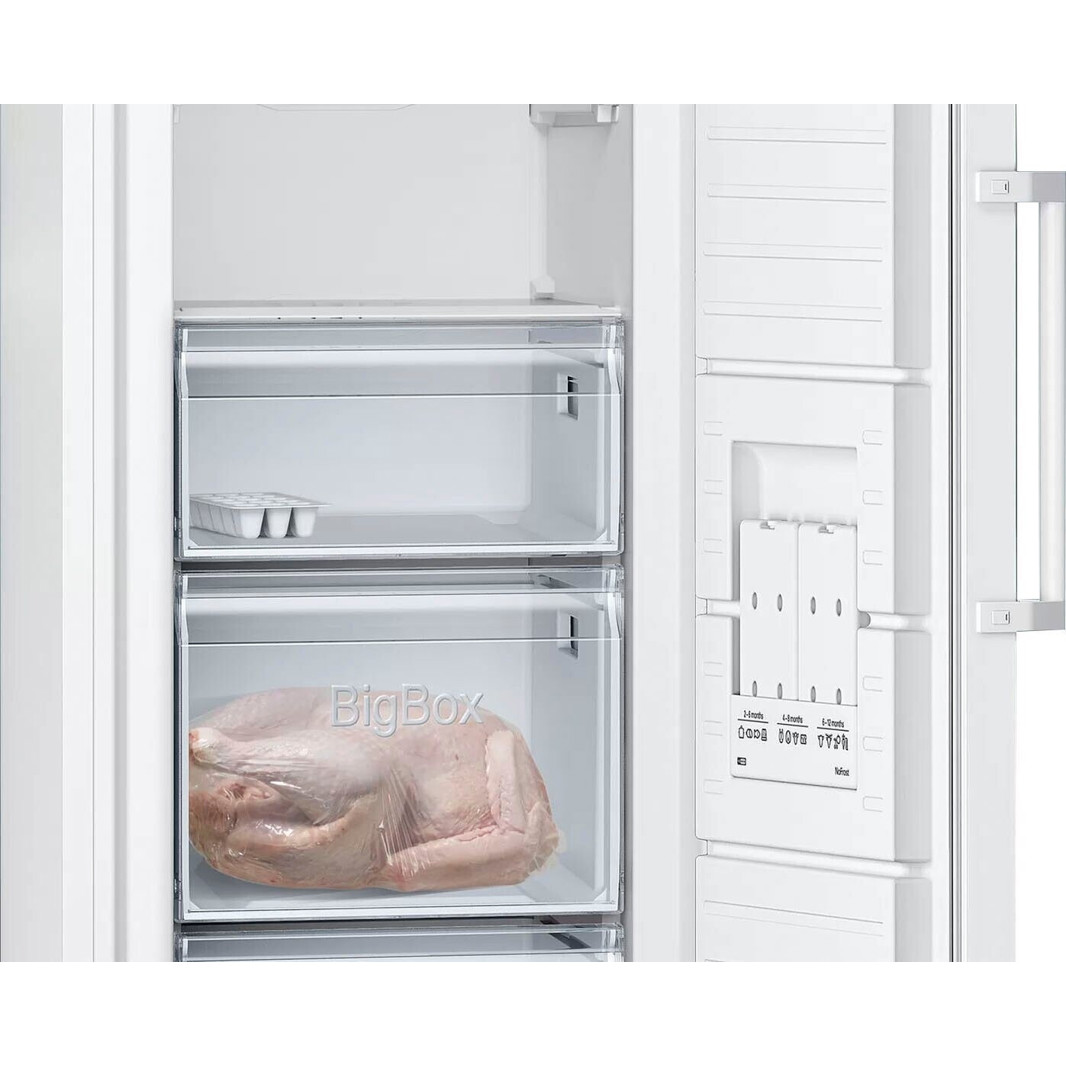 Der Gefrierschrank ist mit der No-Frost-Technologie ausgestattet, die das lästige Abtauen überflüssig macht. Er bietet zudem ein großes Nutzvolumen von 200 Litern und praktische Sicherheitsfunktionen wie einen akustischen Türalarm.