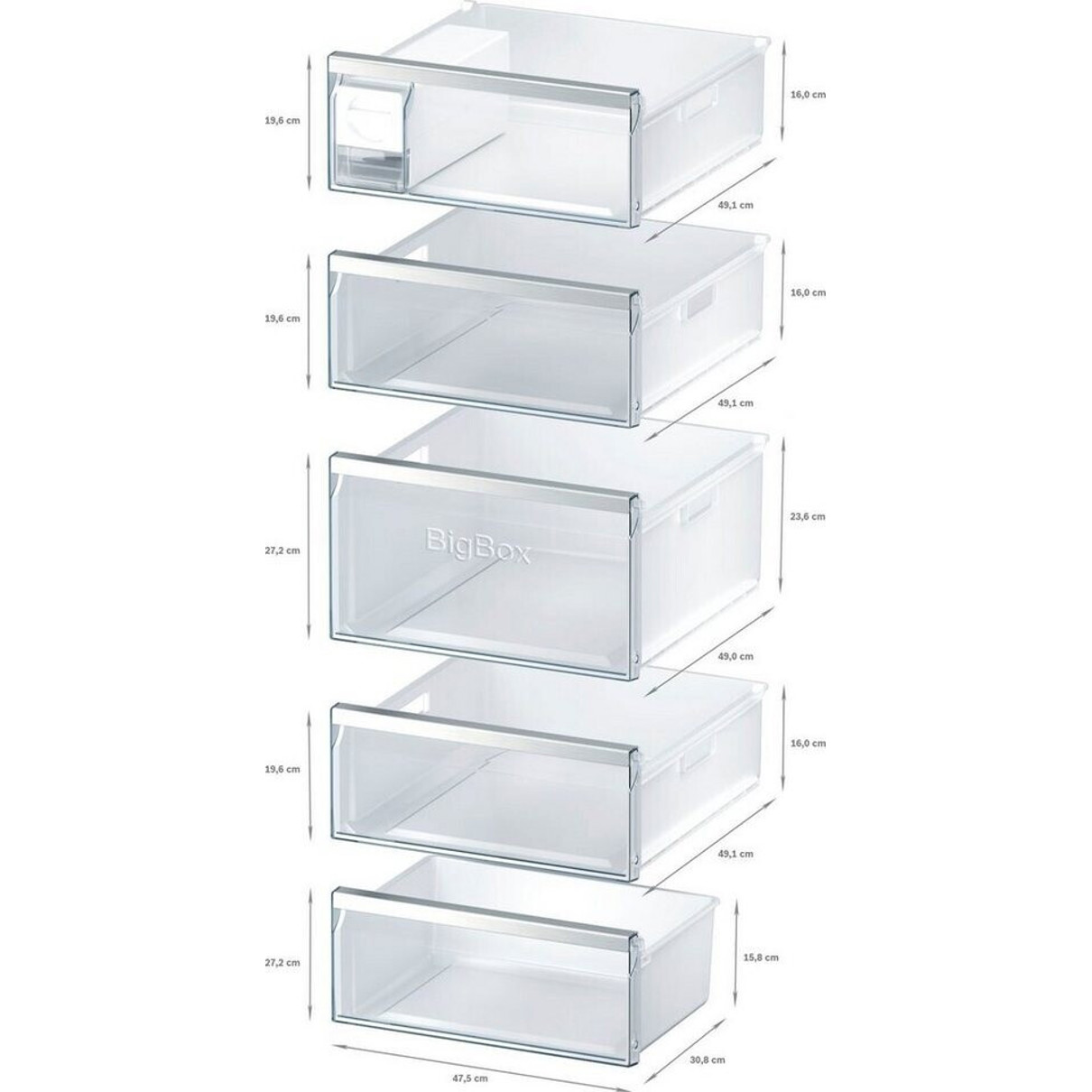 Die hochwertige Ausstattung des Siemens GS58NAWCV umfasst fünf Gefriergutschubladen und eine praktische Innenraumbeleuchtung. Besondere Hersteller-Merkmale wie varioZone und BigBox bieten flexible Lagerungsmöglichkeiten, sodass auch größere Gefriergüter problemlos Platz finden. Zudem ist der Türanschlag wechselbar, was Ihnen maximale Flexibilität bei der Aufstellung des Geräts ermöglicht.